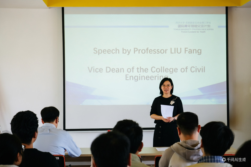 土木工程学院副院长刘芳在致辞中对尼斯索菲亚综合理工学校学生的到访表示欢迎。她简要介绍了土木工程学院的基本情况,并希望中法两国学生以FLY计划为平台,深入交流、共同探索,在学术与文化等多个层面碰撞思想火花,增进彼此了解与友谊。她指出,本次交流不仅是学术上的互动,更是中法青年文化互鉴的宝贵契机,鼓励同学们珍惜平台、展现风采。